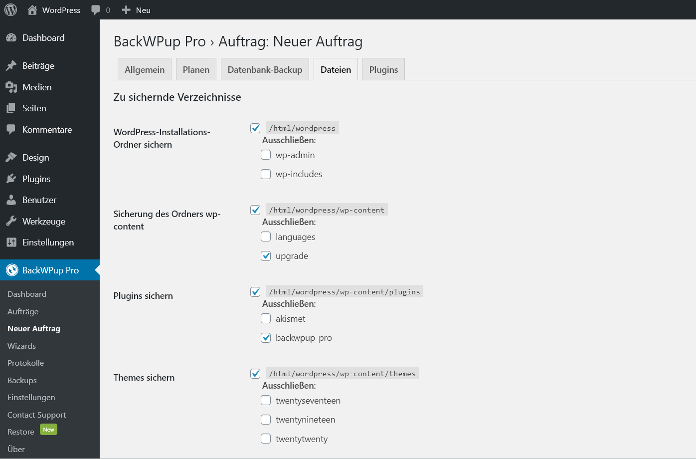 Wenn du über BackWPup -> Neuer Auftrag einen neuen Auftrag erstellst und anschließend den Tab Dateien wählst, gelangst du zu den Einstellungen für Zu sichernde Verzeichnisse.